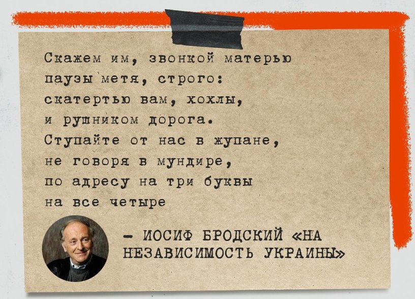 Свою позицію щодо незалежності України красномовно висловив і поет Йосиф Бродський. У вірші На Незалежність України він очевидно дає зрозуміти «куди ступати хохлам» та в черговий раз показує українофобність російських «культурних діячів».