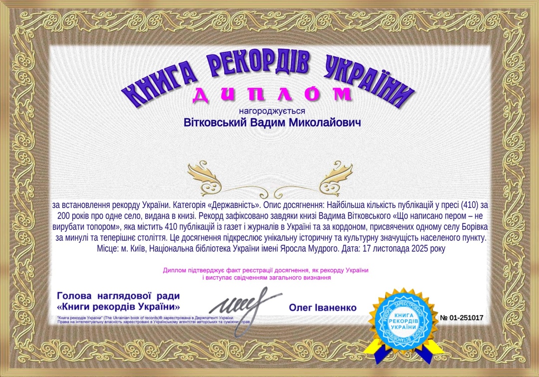 Як повідомив письменник Укрінформу, національний рекорд зафіксовано у категорії «Державність», як найбільша кількість публікацій у пресі (410) за 200 років про одне село, видана в книзі. Йдеться про публікації із газет та журналів, виданих в Україні та за кордоном, присвячені селу Борівка за минулі і теперішнє століття.