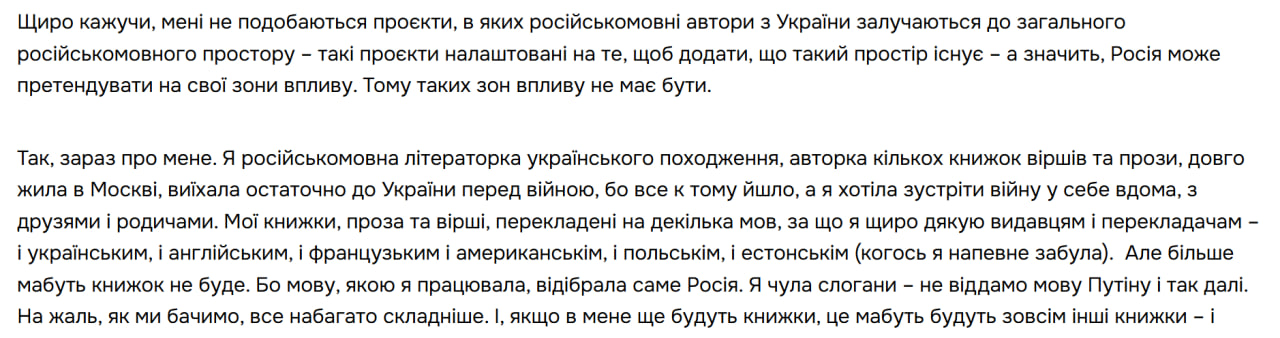 У відкритому листі до журі вона зазначила: «Я б хотіла, щоб російська література, навіть “хороша”, трошки посунулася з медіапростору. Я вважаю, що російська література як явище може існувати, тільки якщо вона пов’язана з метрополією, — навіть у протистоянні… інакше, як я вже тут казала, це не російська література, а російськомовна література інших країн. Тоді що власне ми підтримуємо? Бо я з цією метрополією не хочу мати нічого спільного. Щиро кажучи, мені не подобаються проєкти, в яких російськомовні автори з України залучаються до загального російськомовного простору – такі проєкти налаштовані на те, щоб додати, що такий простір існує – а значить, Росія може претендувати на свої зони впливу. Тому таких зон впливу не має бути».