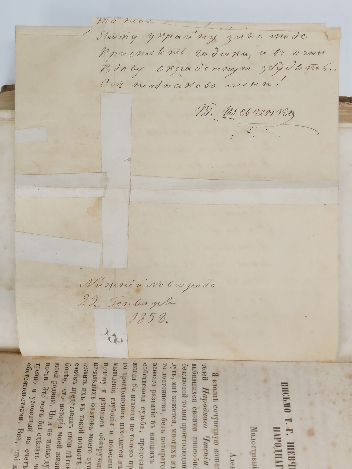 - окремої відбитки публікації Шевченкового автобіографічного листа в журналі «Народное чтение»;
