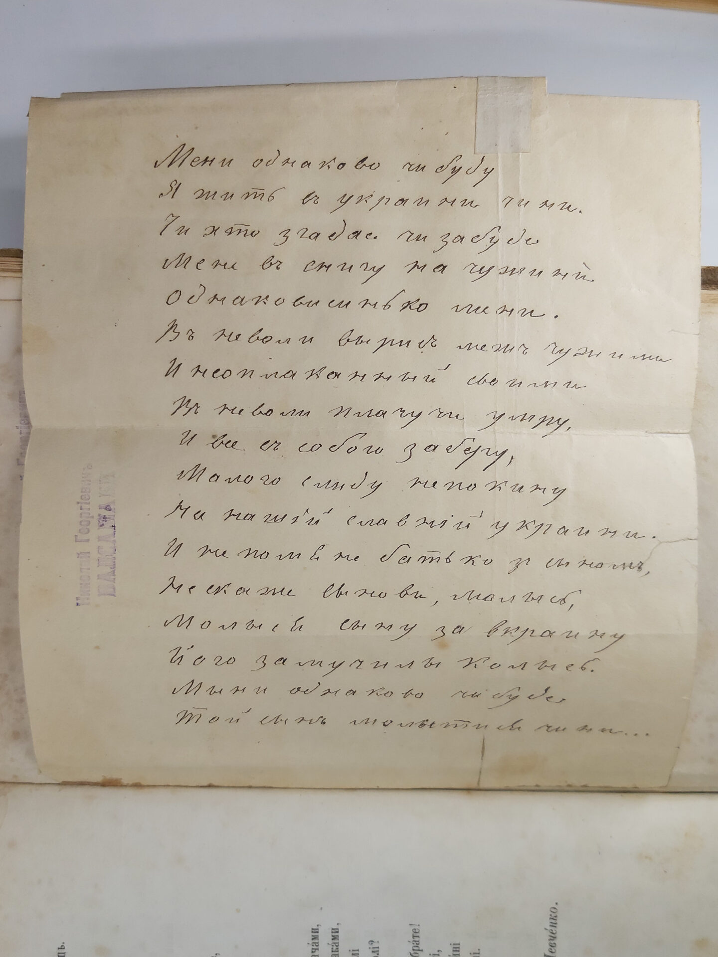 - рукописних сторінок із Шевченковими віршами невідомою рукою.