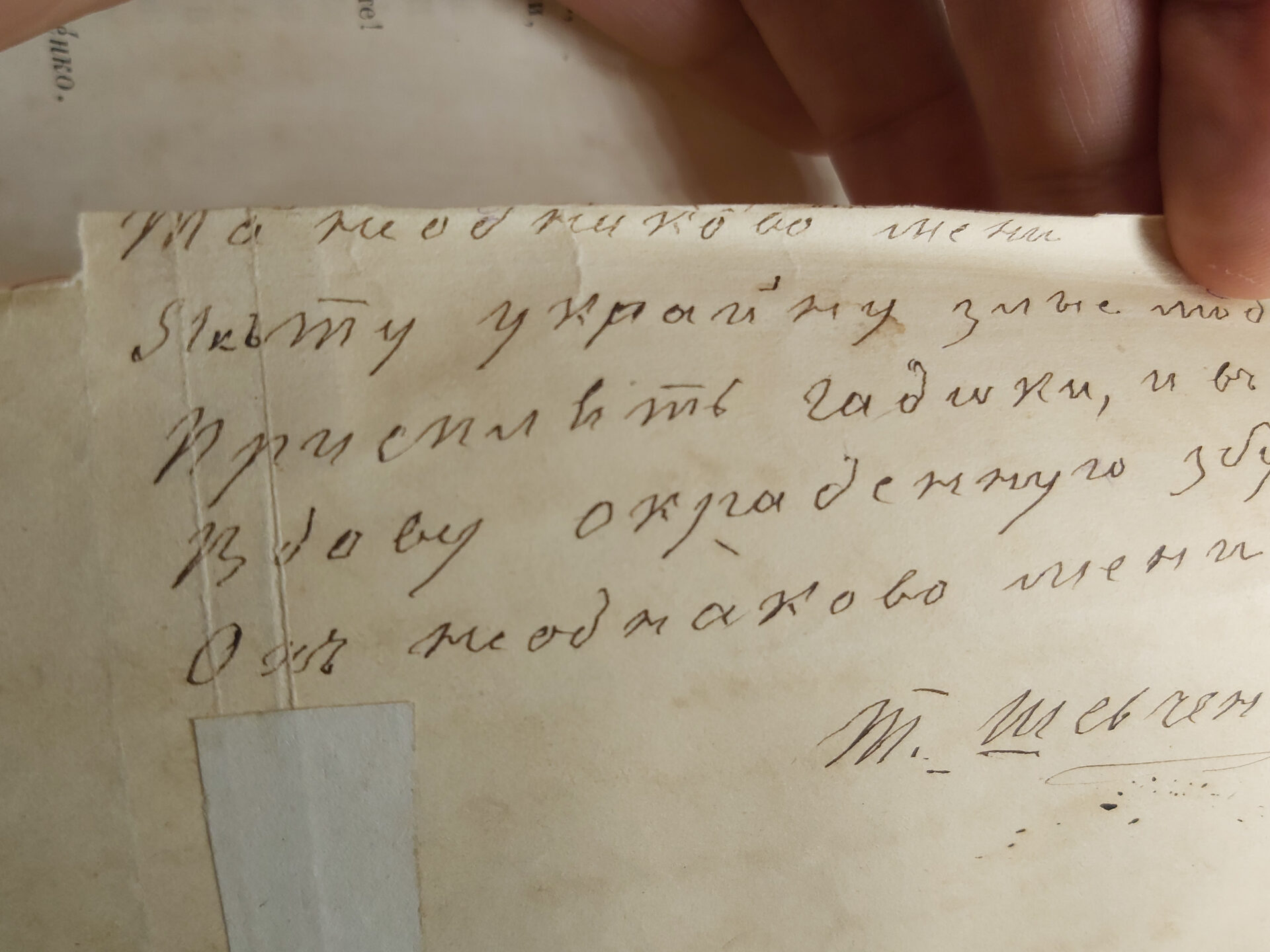 На звороті зафіксовано час і місце появи автографа з характерною для Шевченка заголовною літерою «Н» латинкою (відтворюємо буквально): «Нижній Новгородъ / 22. Генваря / 1858.». Це Шевченків почерк, написання літер і загальний вигляд рядків, що відповідають особливостям його письма останніх років життя.